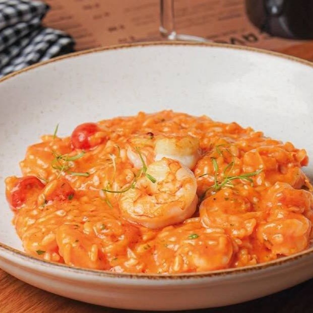 Risoto cremoso de arroz arbório com camarões frescos, ao molho pomodoro basilico e tomates frescos. Um prato leve, aromático e repleto de sabor.