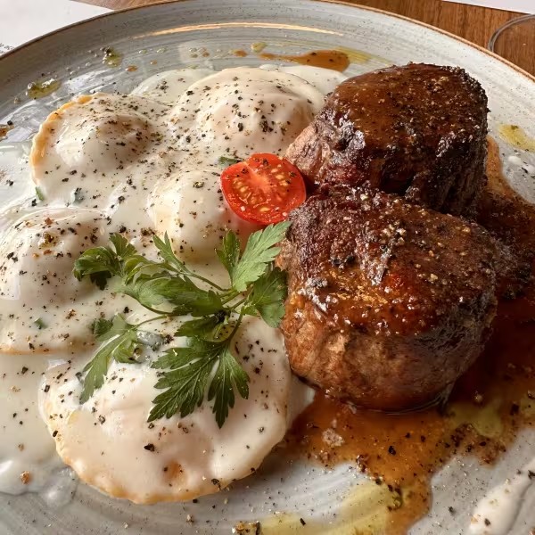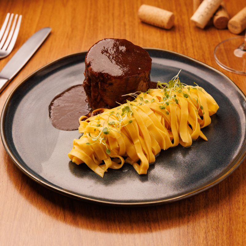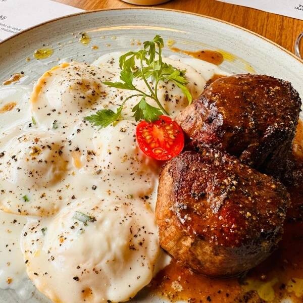 Gnocchi de mandioquinha artesanal, servido com tiras de mignon e tomates frescos ao molho demi-glace. Um prato marcante, de sabor intenso e toque delicadamente macio.