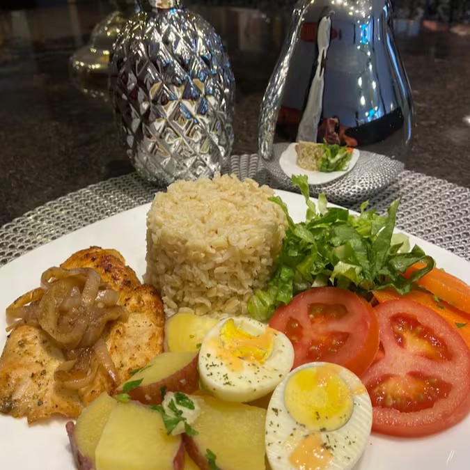 Arroz Integral, Filé de Frango Grelhado, Batata Doce, Ovo Cozido, Salada (alface, tomate e cenoura )