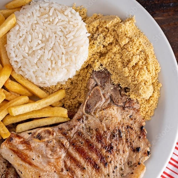 Bisteca carne de porco Acompanha: Arroz, Feijão temperado, Macarrão, Legumes selecionados, Batata frita crocante, salada e farofa da casa.