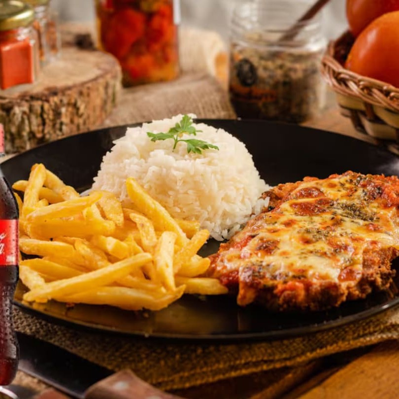 Parmegiana de alcatra com molho especial e queijo gratinado, acompanhado de batata frita crocante . Sabor e qualidade em cada pedaço!