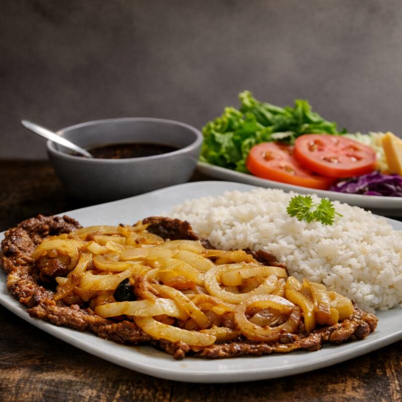 Bife acebolado suculento, acompanhado de arroz, feijão temperado, macarrão, legumes fresquinhos, batata frita crocante, farofa da casa e uma salada refrescante. Preparada com muito carinho para você!