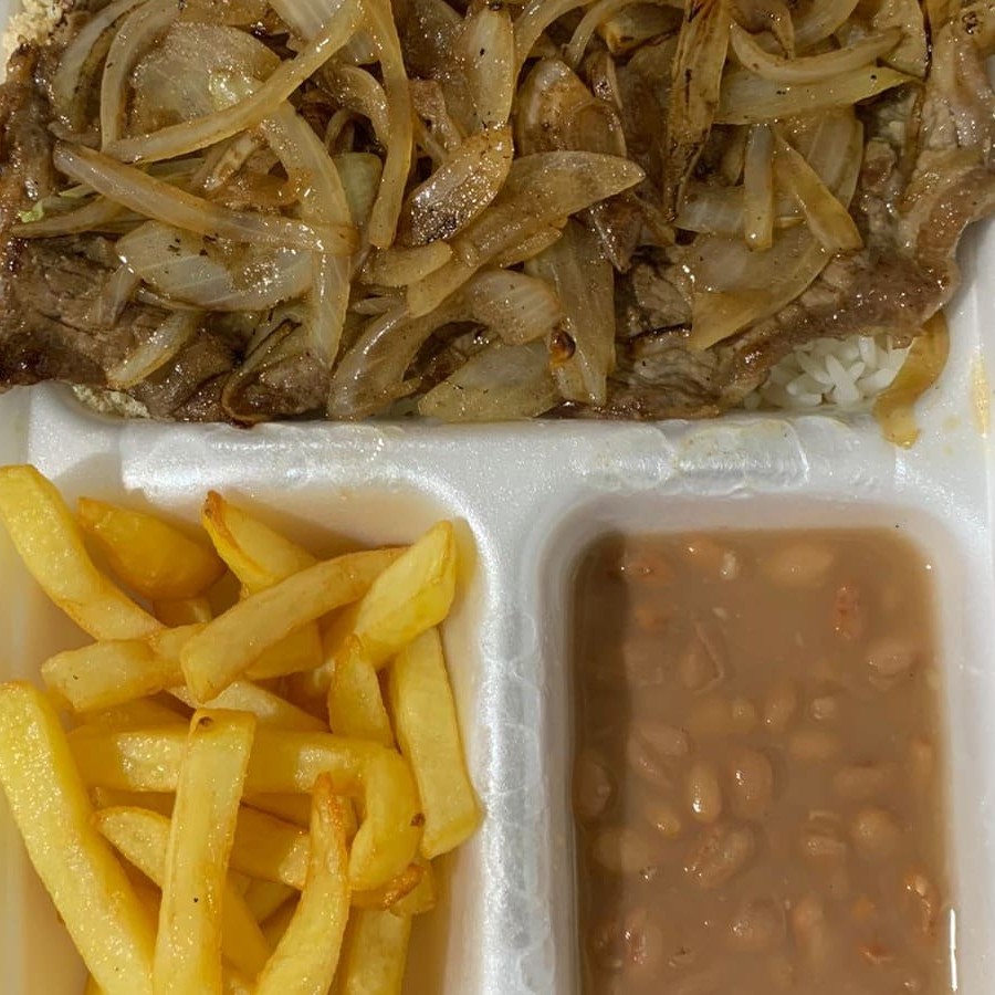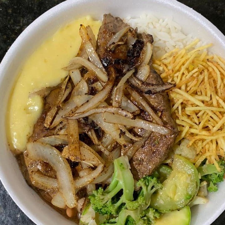 A 'Executiva de Bife acebolado' é uma irresistível marmita executiva que promete uma experiência gastronômica completa. O prato é composto por um saboroso bife acebolado, cuidadosamente grelhado, que é acompanhado por um arroz soltinho, feijão temperado no ponto certo, uma farofa crocante e batatas fritas douradas e sequinhas. Para reforçar o equilíbrio nutricional e o frescor do prato, oferecemos uma cortesia de saladinha, feita com ingredientes frescos e selecionados. E, para completar, um refrigerante de 200 ml para matar a sede. Vale ressaltar que a foto é meramente ilustrativa. Este prato é uma opção perfeita para quem valoriza uma refeição completa, saborosa e de qualidade.