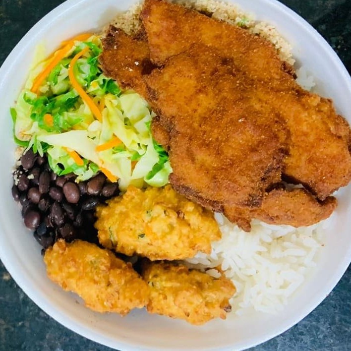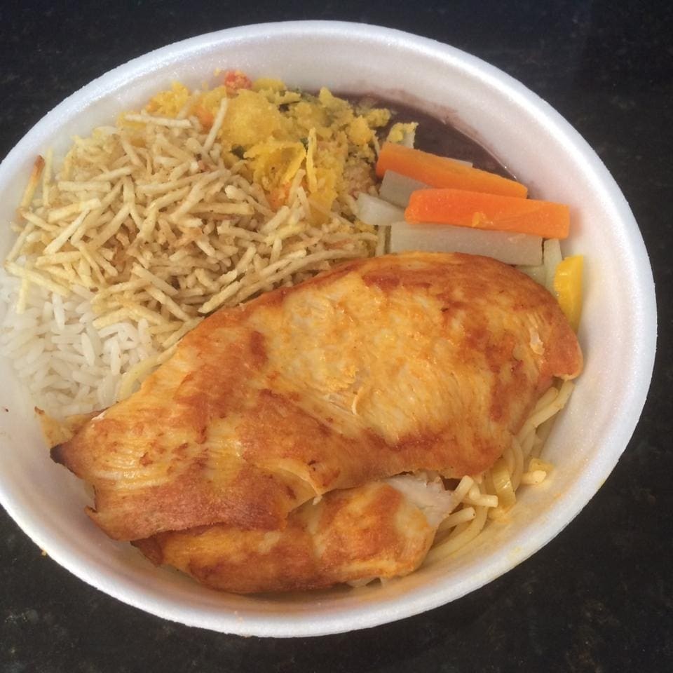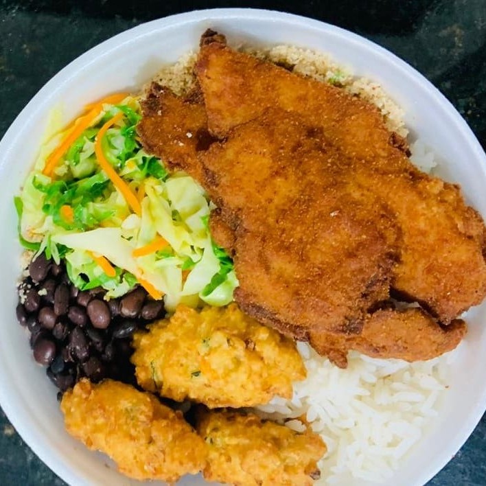 Acompanhamentos: arroz, feijão, legumes e batata frita. Acompanha saladinha cortesia e refrigerante 200ml