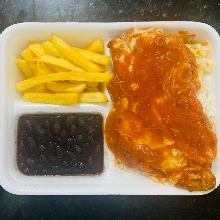 A 'Executiva de bife à parmegiana', da categoria 'Marmitas executivas', é uma verdadeira explosão de sabores. O prato principal consiste em um suculento bife à parmegiana, cuidadosamente empanado e coberto com um molho de tomate caseiro e queijo derretido. Complementando o prato, temos acompanhamentos perfeitamente preparados: um arroz soltinho, um feijão fresquinho, legumes da estação cozidos no ponto certo e batatas fritas crocantes. Além disso, para equilibrar a refeição, oferecemos uma saladinha cortesia, fresca e saborosa. Para finalizar, um refrigerante de 200 ml para refrescar. É a combinação perfeita para uma refeição completa e deliciosa!