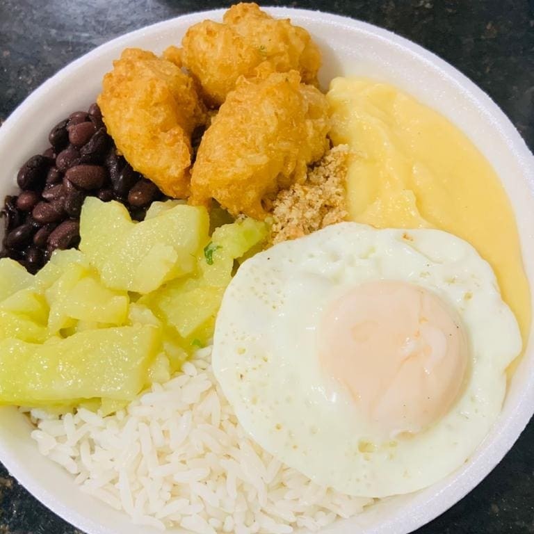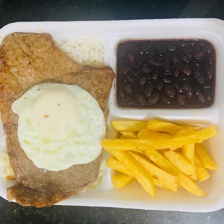 A 'Executiva de Bife à Cavalo' é uma irresistível marmita executiva que promete uma experiência gastronômica completa. O prato é composto por um saboroso bife à cavalo, cuidadosamente grelhado, que é acompanhado por um arroz soltinho, feijão temperado no ponto certo, uma farofa crocante e batatas fritas douradas e sequinhas. Para reforçar o equilíbrio nutricional e o frescor do prato, oferecemos uma cortesia de saladinha, feita com ingredientes frescos e selecionados. E, para completar, um refrigerante de 200 ml para matar a sede. Vale ressaltar que a foto é meramente ilustrativa. Este prato é uma opção perfeita para quem valoriza uma refeição completa, saborosa e de qualidade.