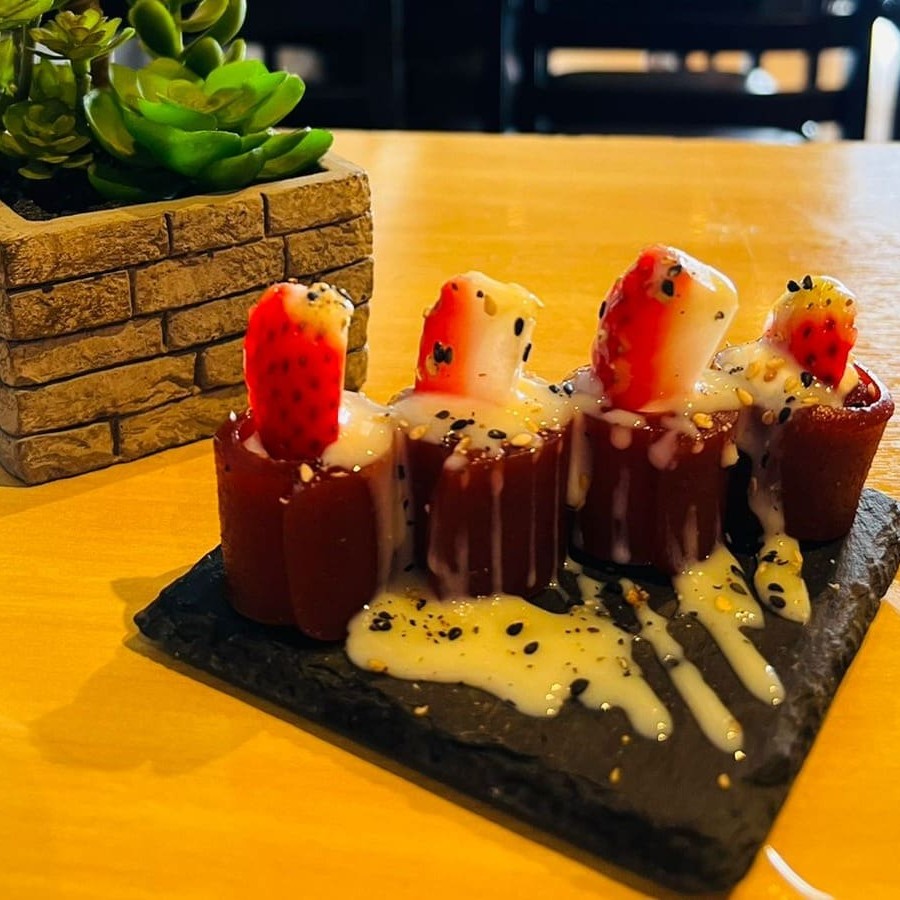 Desfrute de nossa requintada 'Goiabinha 2 pçs' da categoria 'Niguiris'. Este prato é uma combinação sofisticada e tentadora, apresentando um filete de goiabada de alta qualidade, realçado por uma luxuosa camada de cream cheese com toque de morango. Para finalizar, o prato é graciosamente coberto com uma generosa porção de leite condensado, acrescentando uma doçura indulgente que harmoniza perfeitamente com os demais ingredientes. Uma experiência gastronômica inesquecível!