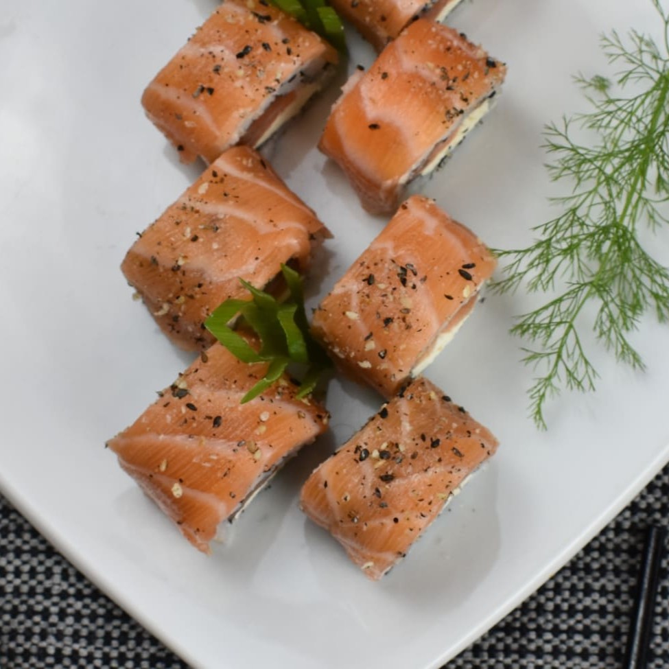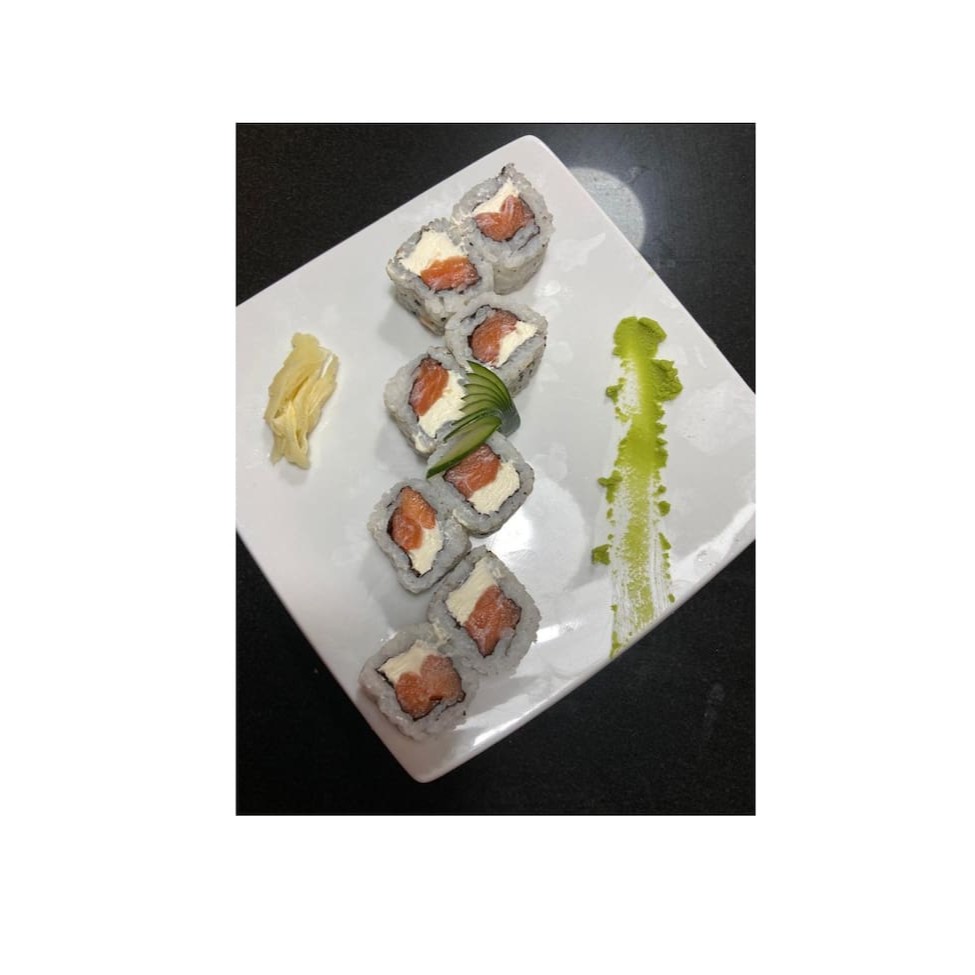 Enrolado de arroz com gergelim, alga,salmão e cream cheese filadelfia