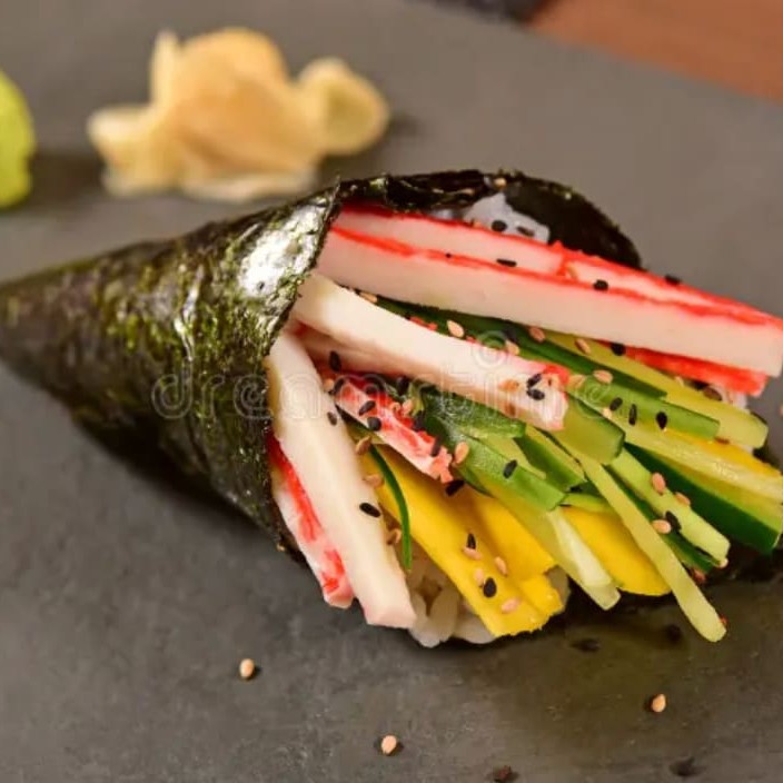 Nosso 'Temaki Califórnia' é um cone de sushi meticulosamente preparado e ricamente recheado com ingredientes frescos e vibrantes. Este prato traz a doçura suculenta da manga, a textura crocante do pepino, e o sabor marinho do kani, todos se unindo em perfeita harmonia. Cada mordida é uma explosão de sabor que captura a essência dos tradicionais temakis. Uma escolha favorita entre os amantes de sushi, nosso 'Temaki Califórnia' é uma celebração de sabores e texturas que promete encantar seu paladar.