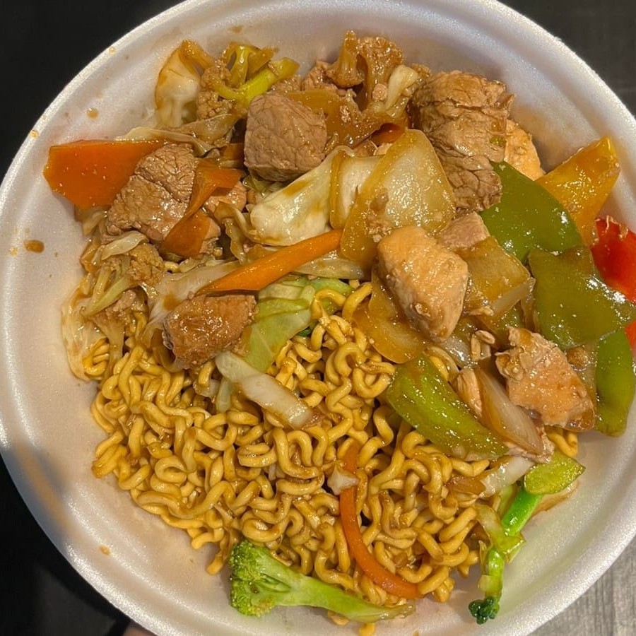Deliciosa Yakissoba G, perfeita para apreciadores de uma boa marmita oriental. Composta por um macarrão tenro e sedoso, combinado harmoniosamente com vegetais frescos e crocantes. O frango xadrez adiciona um toque especial, cortado em cubos e preparado com reverência, enquanto a carne suculenta com legumes traz equilíbrio e sabor intenso ao prato. Uma opção rica e satisfatória na categoria 'Marmitas e Porções', que transborda a essência da culinária oriental.