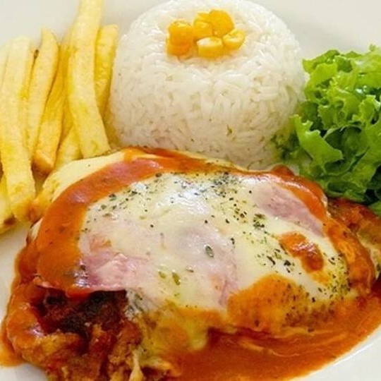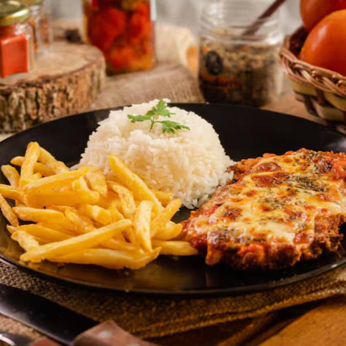 Arroz soltinho, feijão caseiro, batata frita crocante e filé de frango empanado com molho de tomate e queijo derretido.