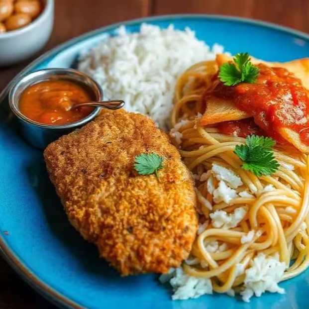 Frango à milanesa empanado e crocante, servido com arroz, feijão temperado, macarrão, legumes selecionados, salada e farofa da casa.