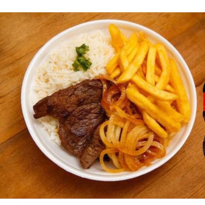 Bife suculento com ovo frito, acompanhado de arroz soltinho, feijão temperado, macarrão, legumes selecionados, batata frita crocante, farofa da casa, salada fresca e refrigerante 200ml.
