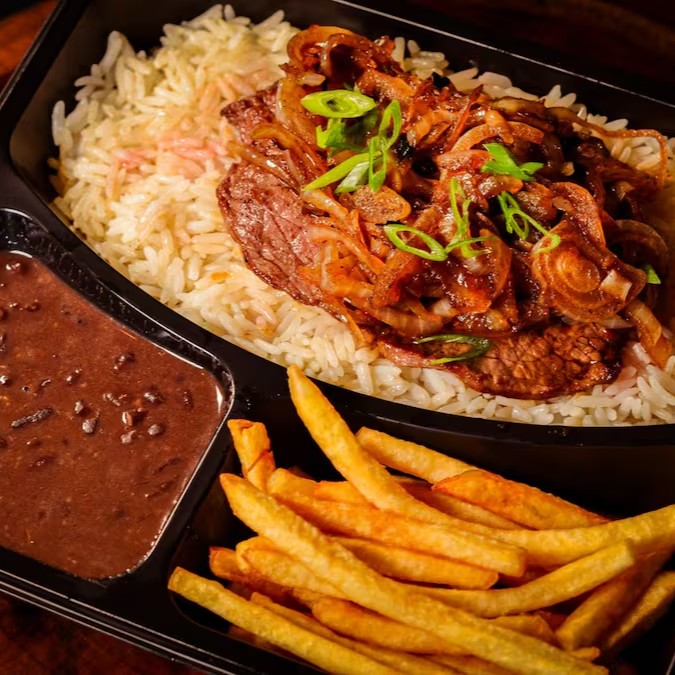 Bife grelhado com cebola, Arroz branco soltinho, feijão do Dia bem temperado e batatas fritas.