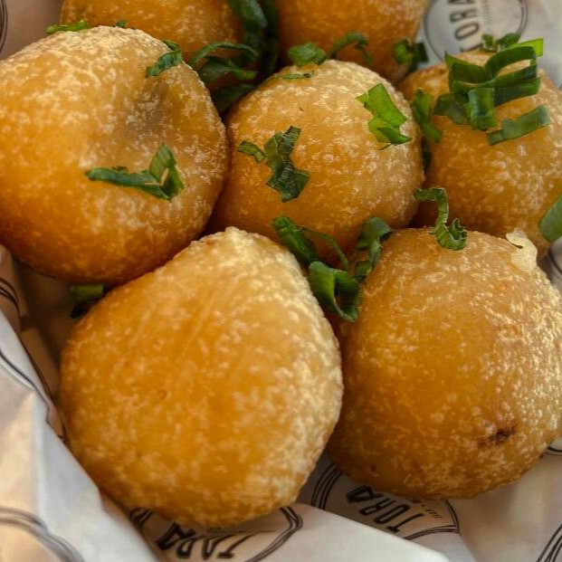 Recheados com carne seca. Acompanha molho de pimenta da casa.
