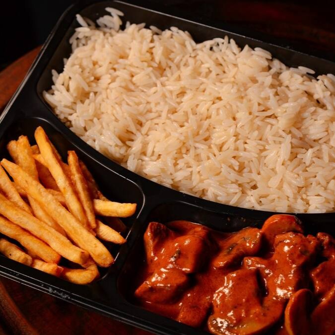 Strogonoff de Carne, preparado com tiras macias de carne em um molho cremoso e saboroso. Acompanha arroz branco soltinho e batatas fritas crocante.