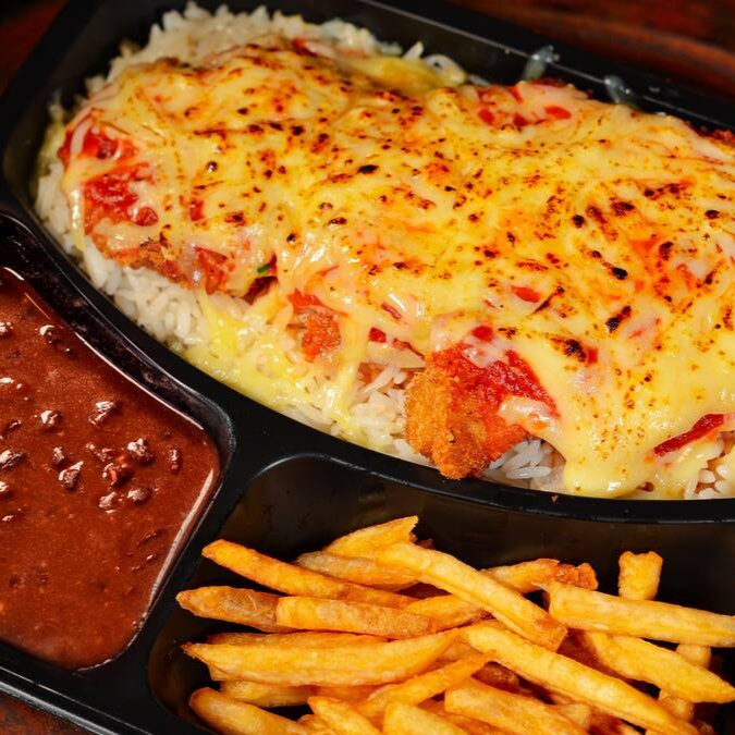 Filé de frango empanado, coberto com um molho de tomate caseiro e uma generosa camada de queijo derretido. Acompanha arroz branco e batatas fritas crocantes.