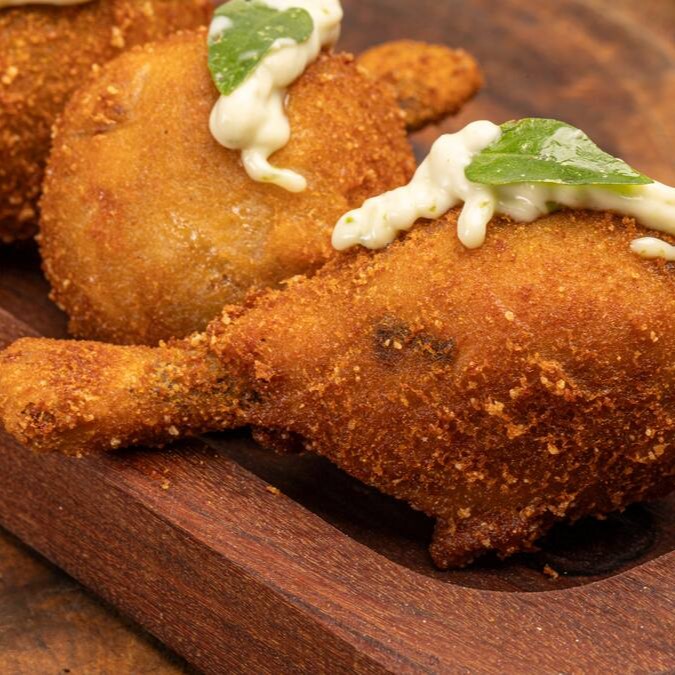 Coxa de frango desfiado montado no osso com batata e queijo, empanado e frito. Acompanha maionese da casa.
