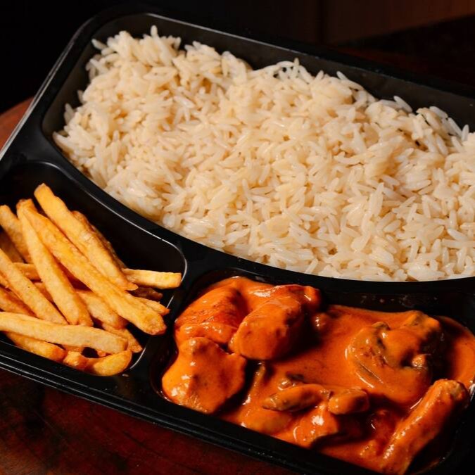 Strogonoff de Frango, feito com pedaços suculentos de frango em um molho cremoso e delicioso. Acompanha arroz branco soltinho e batatas fritas crocante.