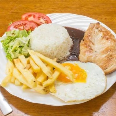 Arroz branco soltinho, feijão, farofa, filé de frango grelhado, ovo.