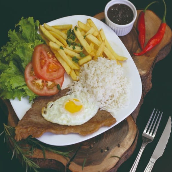 Suculento bife grelhado, ovo, acompanha salada mista, arroz branco, feijão e batata frita. Tags: Suculento bife grelhado bife grelhado bife bife com ovo