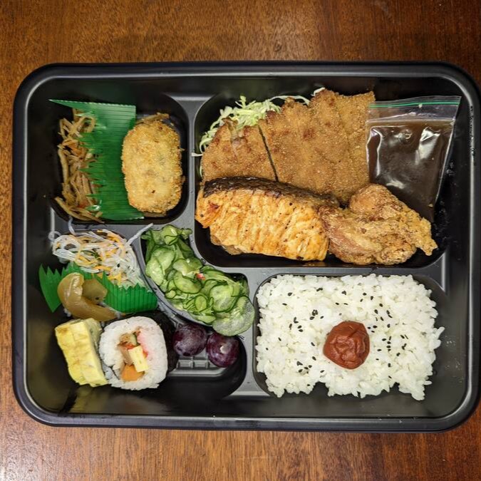 Tradicional marmita japonesa composta por arroz branco japonês, omelete japonês, Tonkatsu (lombo suíno empanado), karaague (frango frito ao estilo japonês), peixe grelhado, conservas e acompanhamentos do Dia. *Imagem meramente ilustrativa.