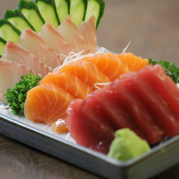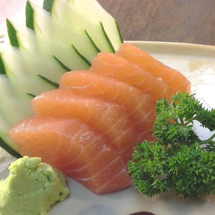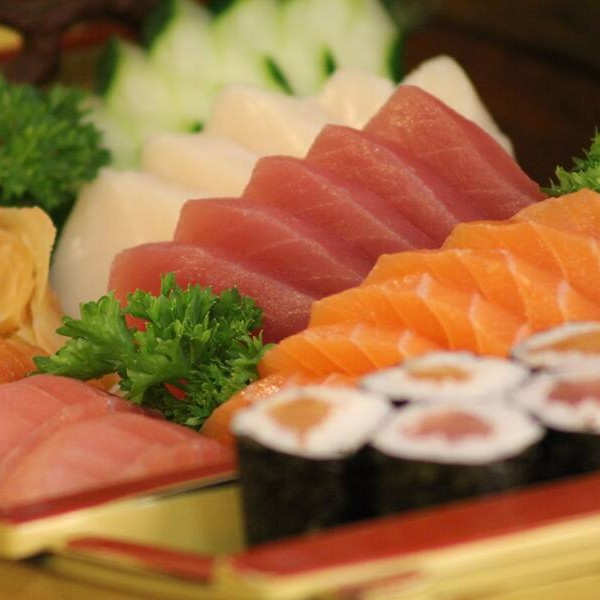 5 fatias de salmão, 5 atum, 5 peixe branco.