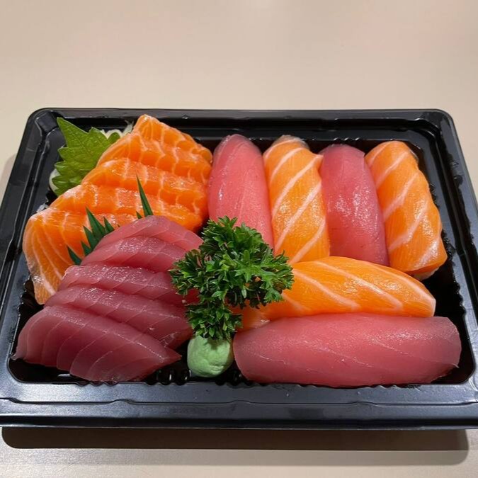 Combo 8: 5 Sashimi salmão, 5 Sashimi atum, 3 Niguiri salmão e 3 Niguiri atum.