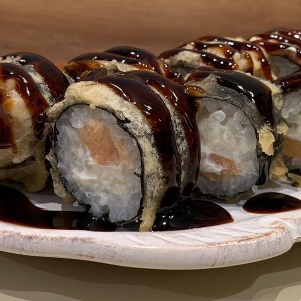 Rolinho primavera recheado com mussarela e cream cheese. Acompanha molho tonkatsu.