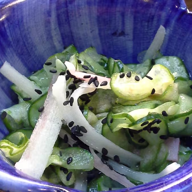 Arroz, alga, gergelim, manga, kanikama e pepino.
