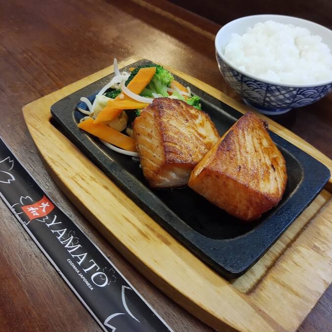 Salmão e legumes grelhados na manteiga. Acompanha arroz branco japonês.