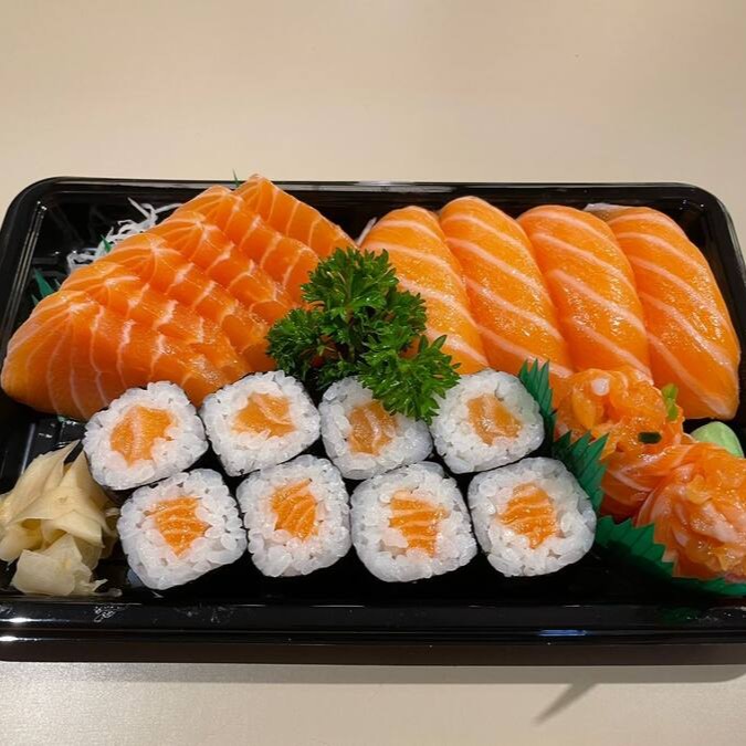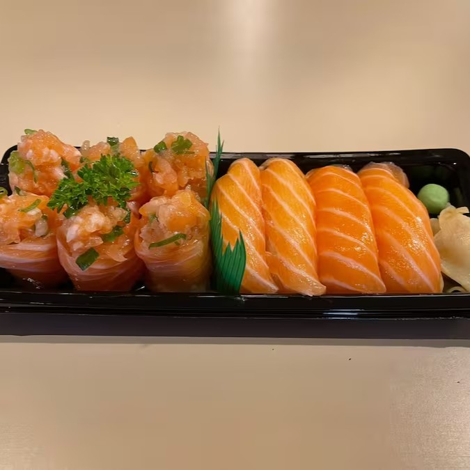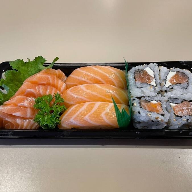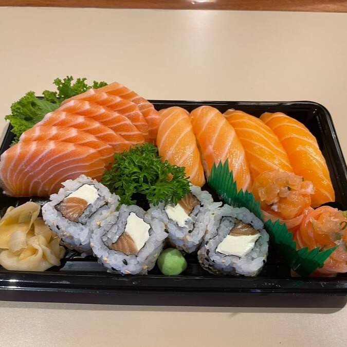 5 sashimi salmão, 4 niguiri salmão, 4 uramaki filadélfia e 2 salmão jo.