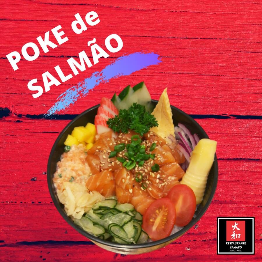 Base de arroz japonês com tempero de sushi, salmão/atum com molho poke especial, sunomono, cebola roxa, omelete japonês, kani, manga, tomate cereja, pepino, gengibre em conserva, cebolinha e gergelim