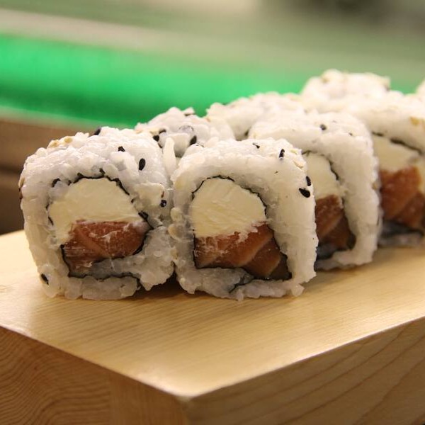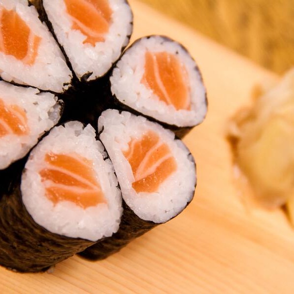 Arroz enrolado com fatia de salmão e coberto com salmão, cebolinha e maionese.