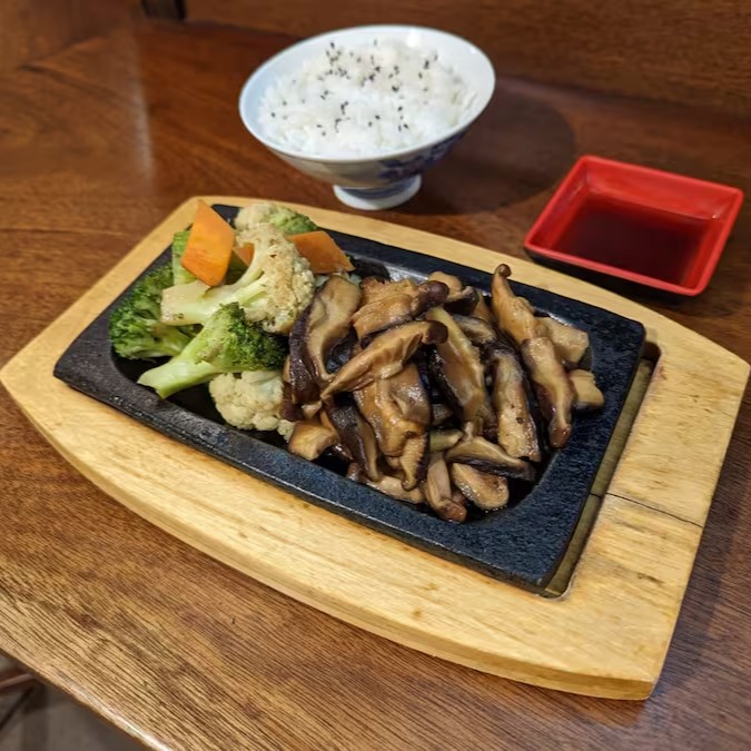 Shitake e legumes grelhados na manteiga. Acompanha arroz branco.