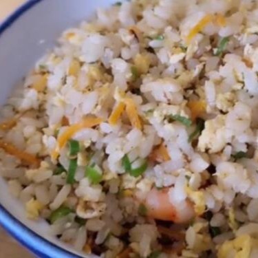 Camarão, arroz, vagem, cenoura, ovo, cebolinha, oleo de gergelim, molho de peixe, shoyu e sal.