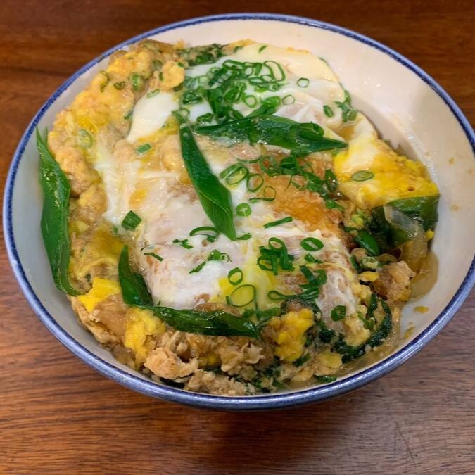 Arroz branco japonês coberto com lombo de porco empanado, ovo, cebola e cebolinha com molho de shoyu levemente adocicado.