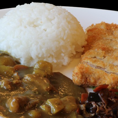 Arroz branco japonês, molho a base de curry (karê), frango empanado. Acompanha Frango Frito e tsukemono (conserva japonesa). *Contém carne de porco no tempero do curry.