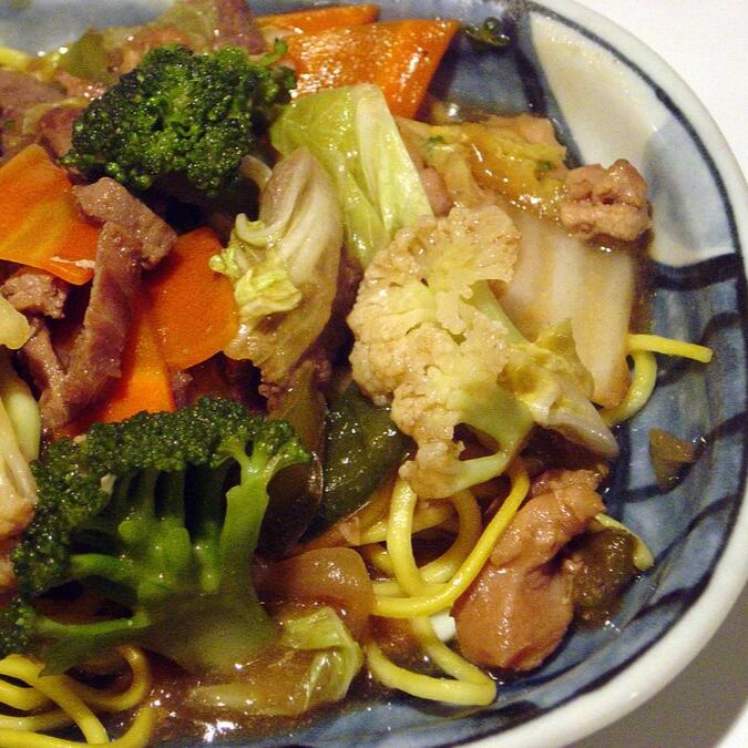 Yakissoba Misto: Macarrão, carne bovina, frango, acelga, cenoura, couve flor, brócolis e cebola.
