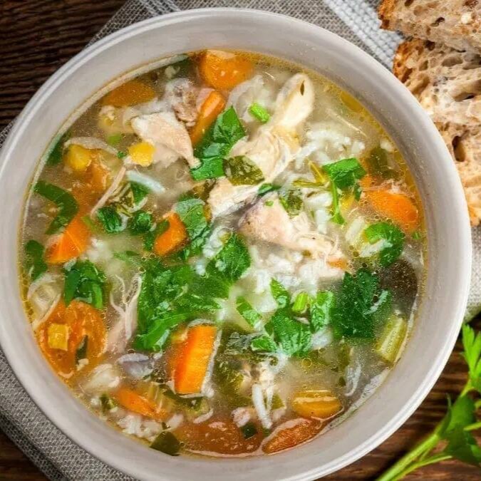 Ingredientes: filé de peito, cebola, batata, chuchu, cenoura, arroz, salsinha e especiarias.
