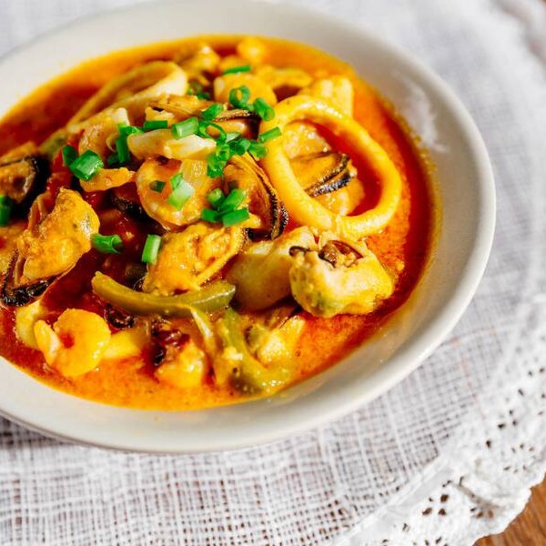 Ingredientes: camarão, marisco, peixe, lula, carne siri, tomate, leite de coco, alho, cebola ralada, salsinha, pimenta reino, sal e especiarias.