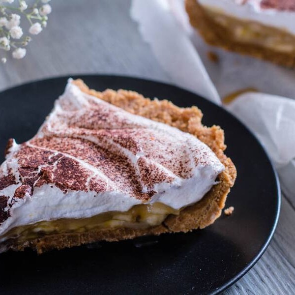 Torta com massas crocante, doce de leite, banana e chantilly.