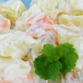 Maionese, batatas, cenoura, salsinha, estilo caseira.