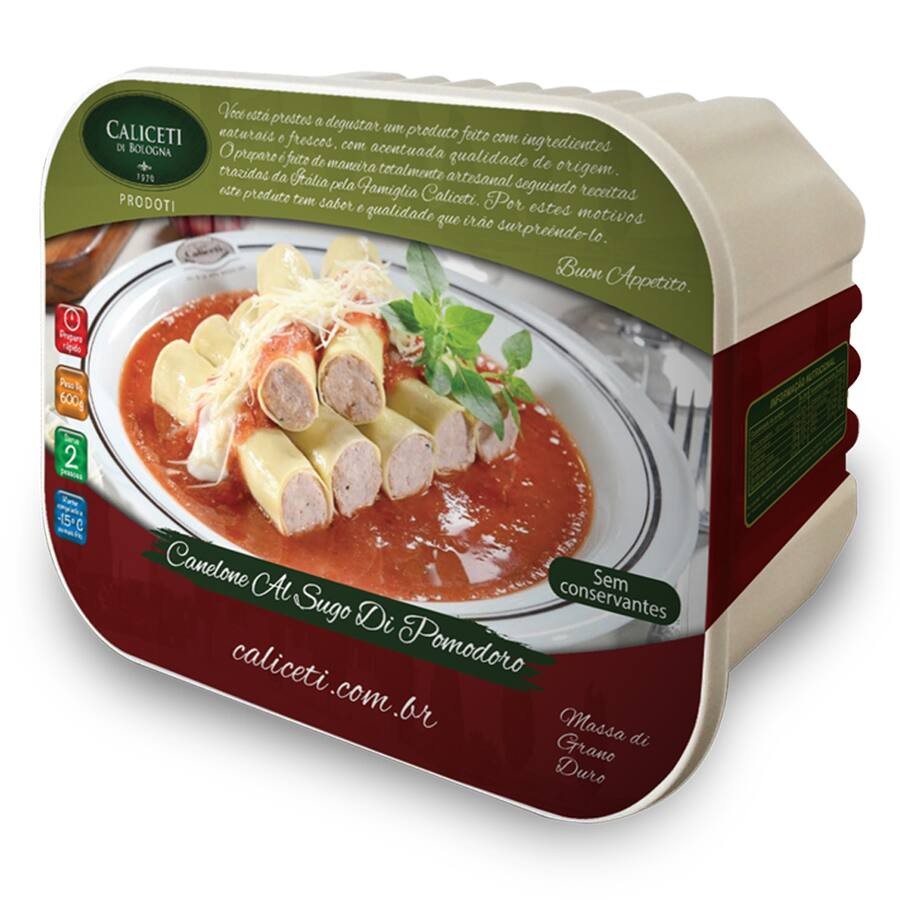 Caneloni recheado, servido com molho sugo, ideal para 2 pessoas, com aproximadamente 600g. Pronto para aquecer e saborear.