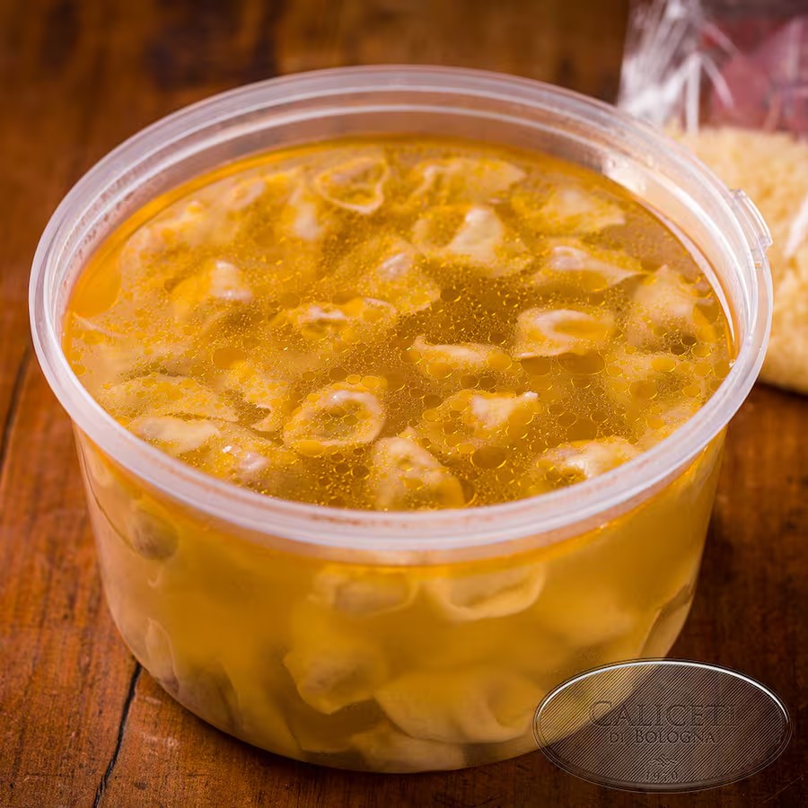 Capeleti (ou agnolini) recheado com carne bovina cozida e temperada com noz-moscada. Produzido manualmente, deve ser cozido em água fervente com sal. Para cada pessoa, calcule 200g.