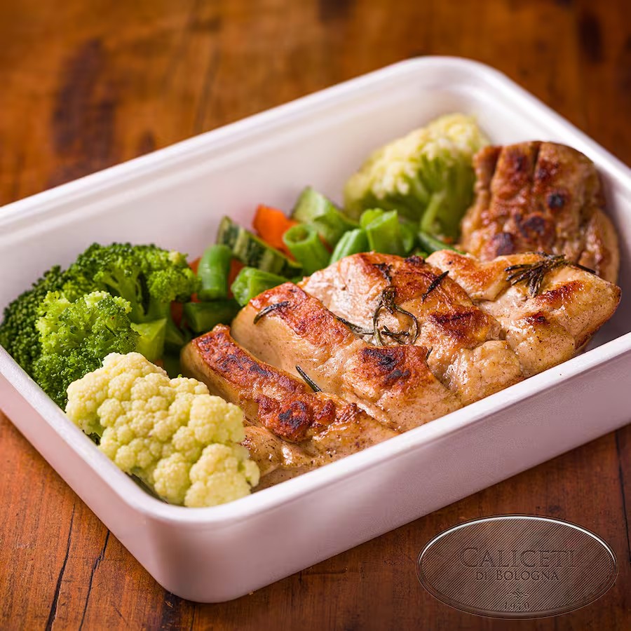 Peito e sobrecoxa de frango grelhados com alecrim. Acompanha gnocchi, talharim ou verduras coloridas cozidas. Serve duas pessoas.