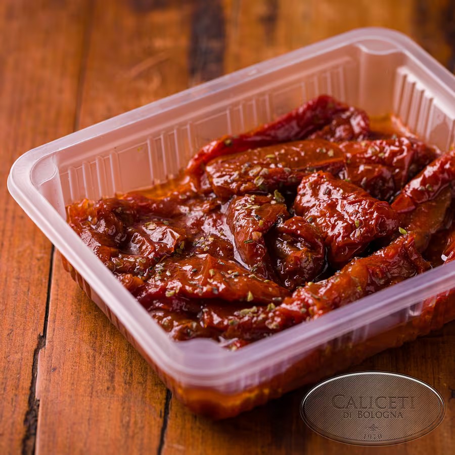 Tomates secos marinados no azeite. Porção de 250g. Sabor intenso e perfeito como antipasto ou acompanhamento.