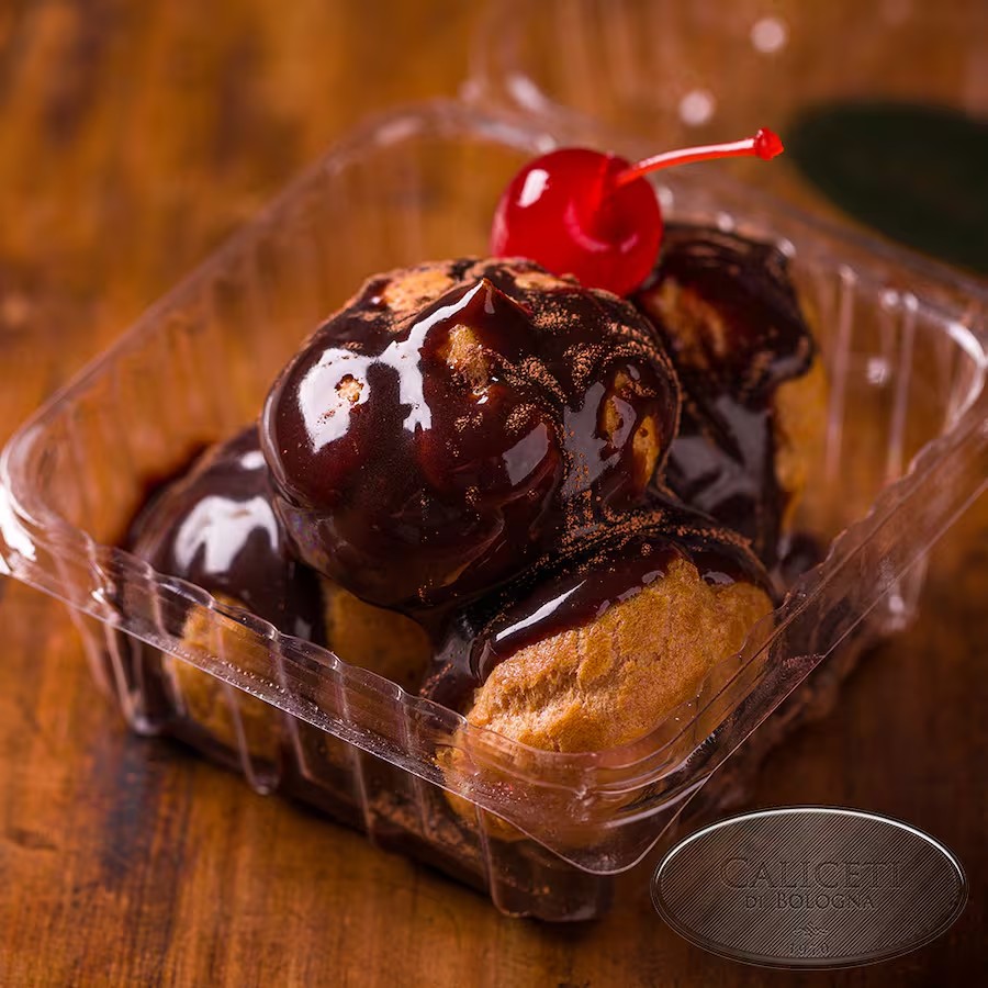 Deliciosos profiteroles recheados com gelato de creme, cobertos com calda de chocolate. Uma explosão de sabor em cada mordida.