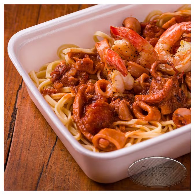 Massa artesanal à base de ovos e farinha de grano duro, servida com molho de tomate, alho e frutos do mar. Porção de aproximadamente 600 g a 650 g. Serve uma pessoa.