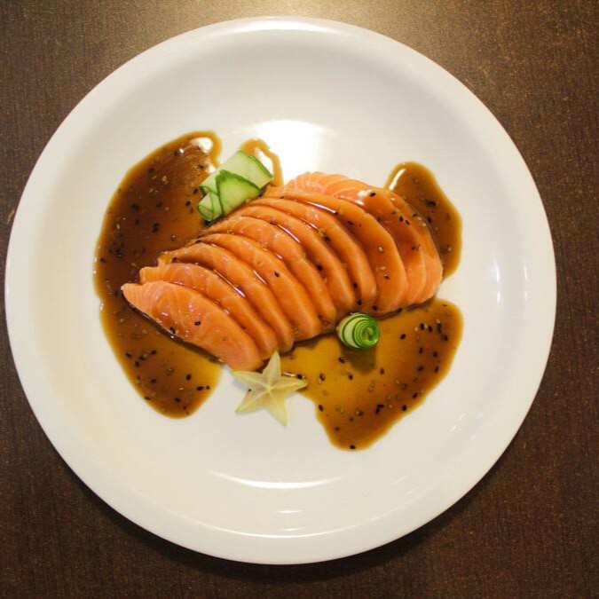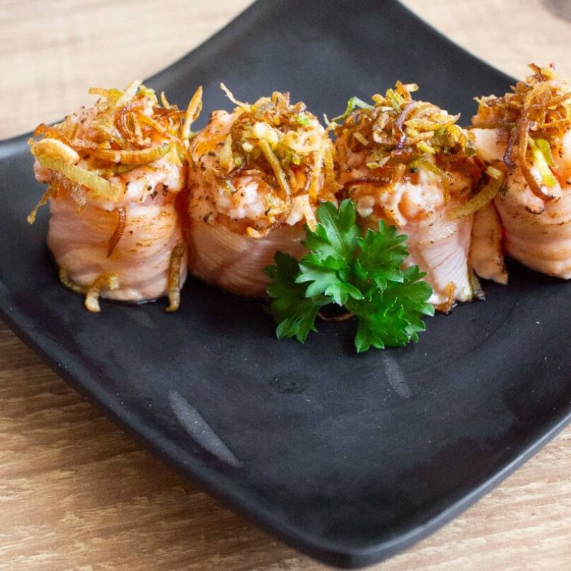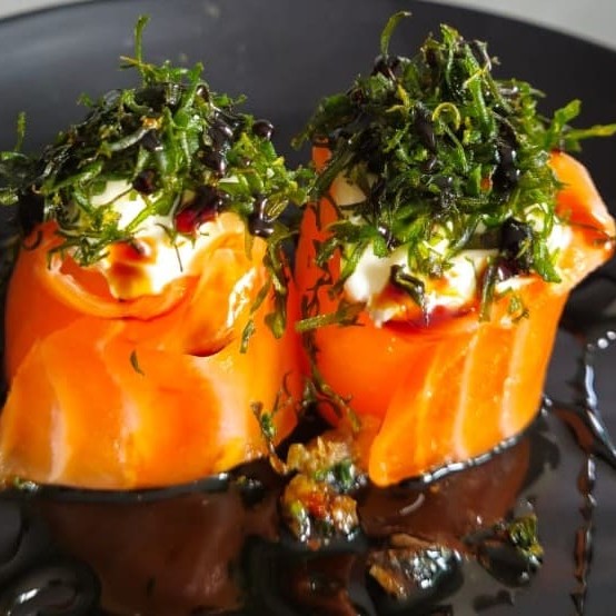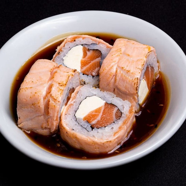 Recheado com salmão e cream cheese, enrolado no salmão e maçaricado finalizado com molho de ostras. Molho enviado à parte.